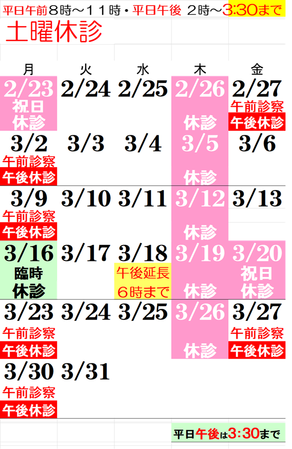 2026年3月診療日・休診日